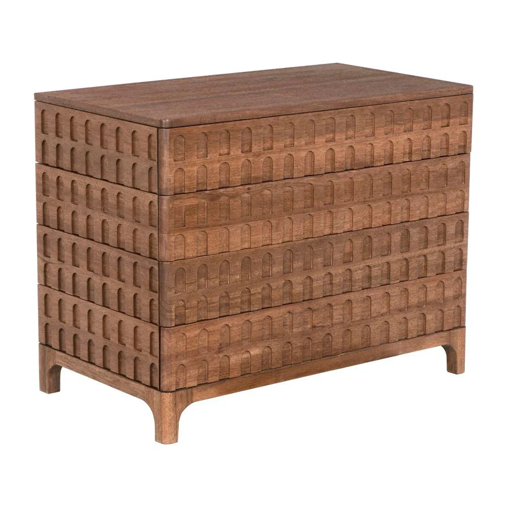 Crafted from high-quality Walnut wood and veneer, the Regent Cabinet combines durability with natural beauty. Its Dark Walnut finish adds a touch of warmth and richness, enhancing the distinctive grain patterns of the wood. This cabinet is an elegant addition to any room, offering both style and functionality. The smooth surface and clean lines make it a versatile piece that complements a variety of interior designs. The Regent Cabinet features a rectangular shape with four spacious drawers, providing ample storage for your essentials. The textured geometric pattern on the drawer fronts adds a unique touch, elevating its overall design.