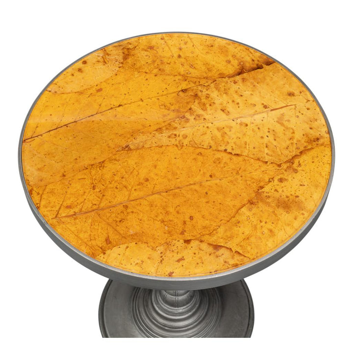 The Banner House Side Table combines a neoclassical design with modern industrial flair. Crafted with a sturdy cast aluminum base in a gunmetal finish, this side table stands at an elegant 25 inches high. Its 20-inch round top showcases the unique artistry of tobacco leaves, crafted by Artisan Leaf LLC, adding a touch of nature and history to any room. The table's brown and grey hues make it versatile for various decor styles, from contemporary to traditional. This piece not only honors the craftsmanship of Sarreid Ltd but also reflects the spirit of the local community, making it a beautiful and meaningful addition to your home.