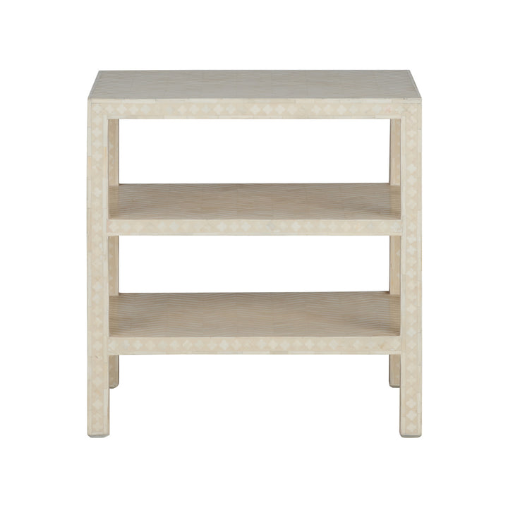Chevron Inlay Side Table With Stylish Open Shelves Features: