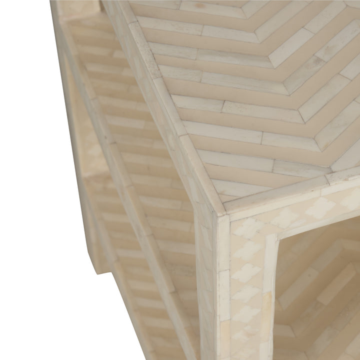 This side table adds charm and function to any space with its eye-catching chevron inlay. Made of wood and finished in a soft cream color, it features three open shelves perfect for showcasing lamps, books, or decorative accents. The rectangular design and sturdy legs give it a reliable structure while the smooth finish ensures a polished look. Whether placed in a living room or bedroom, this versatile piece effortlessly blends style with practicality, making it a great addition to any home. Its open design allows for easy access, enhancing both its function and decorative appeal.