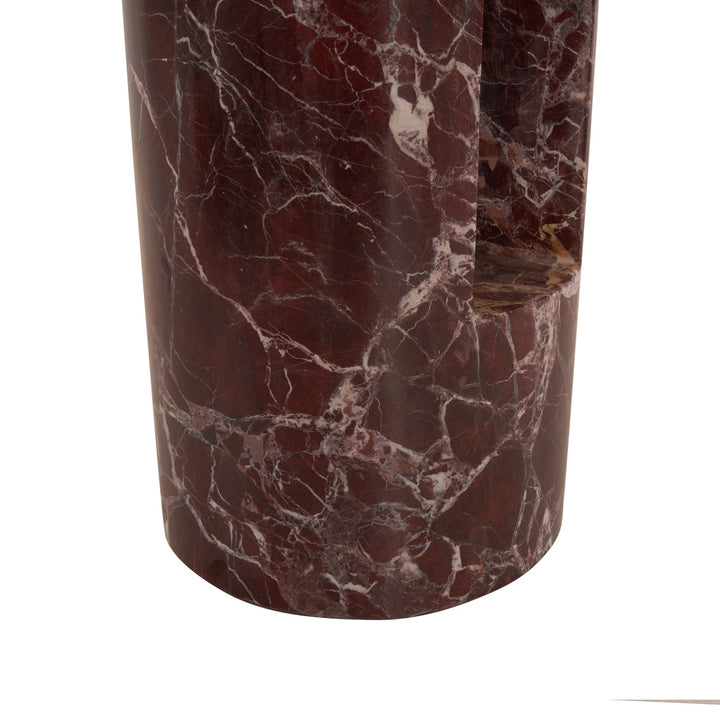 This marble side table brings a touch of elegance to any room. With its dark red color and natural white veining, it offers a sophisticated look that fits well in both modern and traditional spaces. The sleek silhouette and clean lines create a timeless piece that easily complements your existing decor. The smooth finish of the marble adds a luxurious feel, making it not only a functional piece but also a beautiful statement. The cylindrical pedestal base provides stability while enhancing the table's refined design. Perfect for showcasing your favorite lamp or decorative items, this side table is a versatile addition to your home.