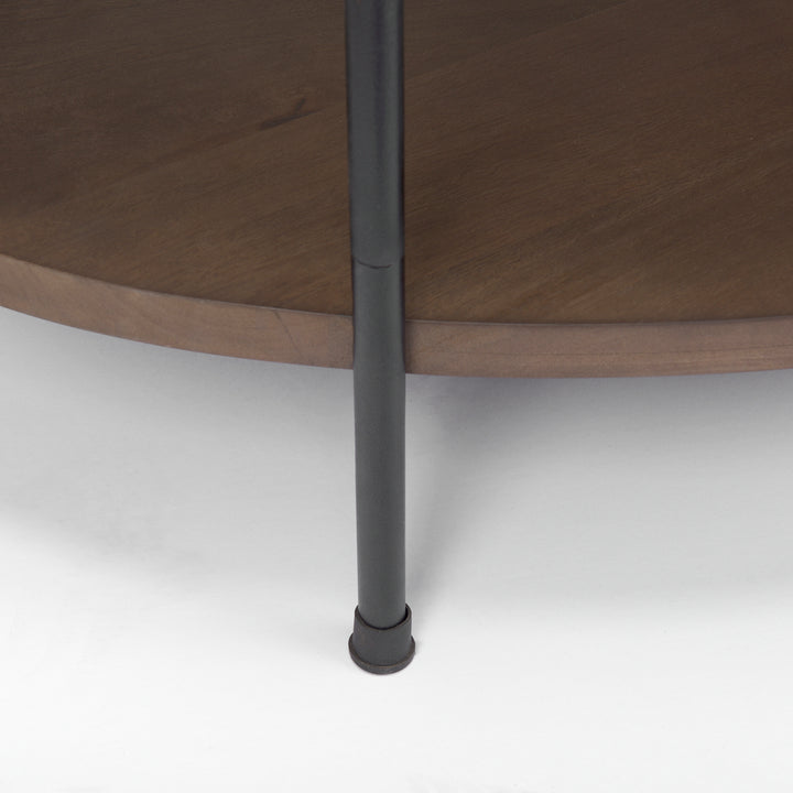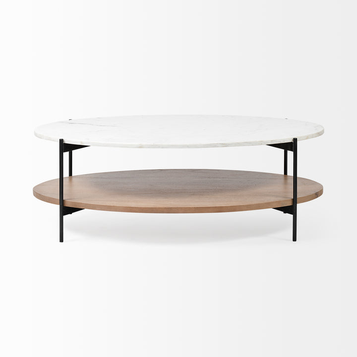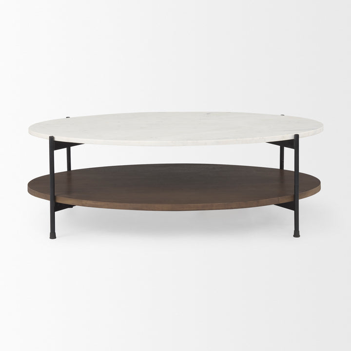 - This 2-tier coffee table comprises two oval surfaces, a beautiful marble top and lower solid mango wood bottom shelf, supported by a black iron frame.