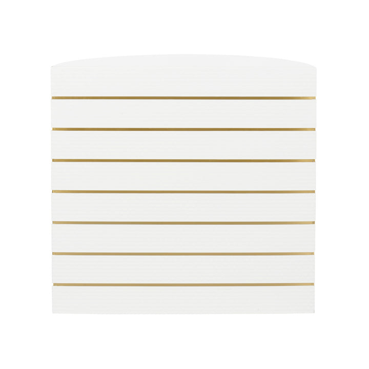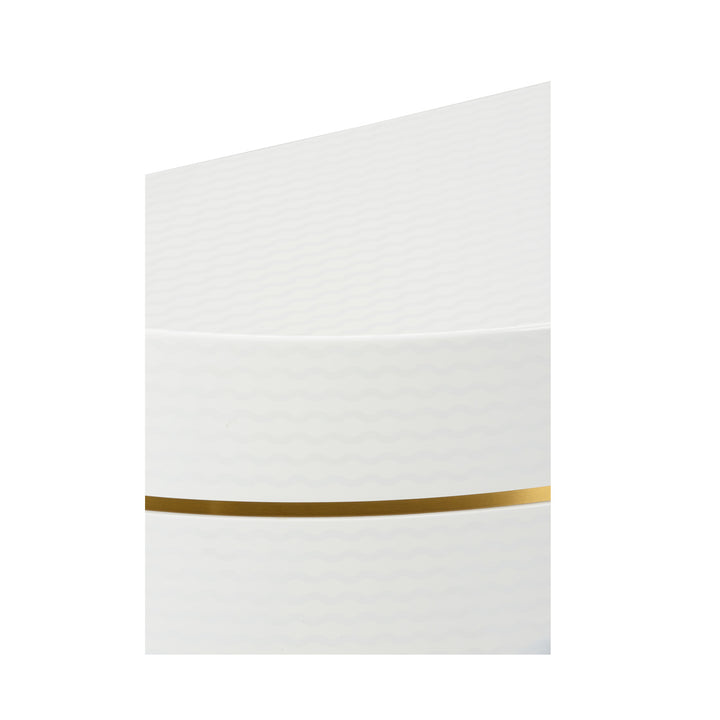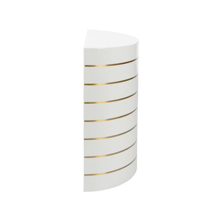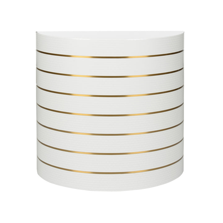 Bring an unexpected look to your space with the Luna Console. Its rounded design with white lacquered textured weave paneling and touches of antique brass sheet metal banding will surely bring flair to any room. The console features a semi-circular shape that adds a touch of modern elegance. Crafted from wood, it combines durability with a stylish aesthetic. The white color and gold accents make it a versatile piece that can easily blend with different decor styles. Designed by Elizabeth Wicker, this console is both functional and visually appealing, making it a great addition to any home.