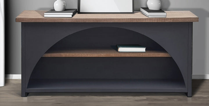 The Savanah Console Table Modern Console Table Elegance is a stylish piece that fits well in any space. Its minimalist design features a striking arch detail that adds a touch of sophistication. The table has a two-tone finish with a dark base and a contrasting wood-finished top and shelf, creating a modern look. The top and middle shelf offer ample room for showcasing decorative items, storing books, or holding electronic devices. Crafted from mahogany, this table is sturdy and durable, making it a versatile addition to living rooms, entryways, or office spaces. Plus, it requires no assembly, allowing for easy setup.