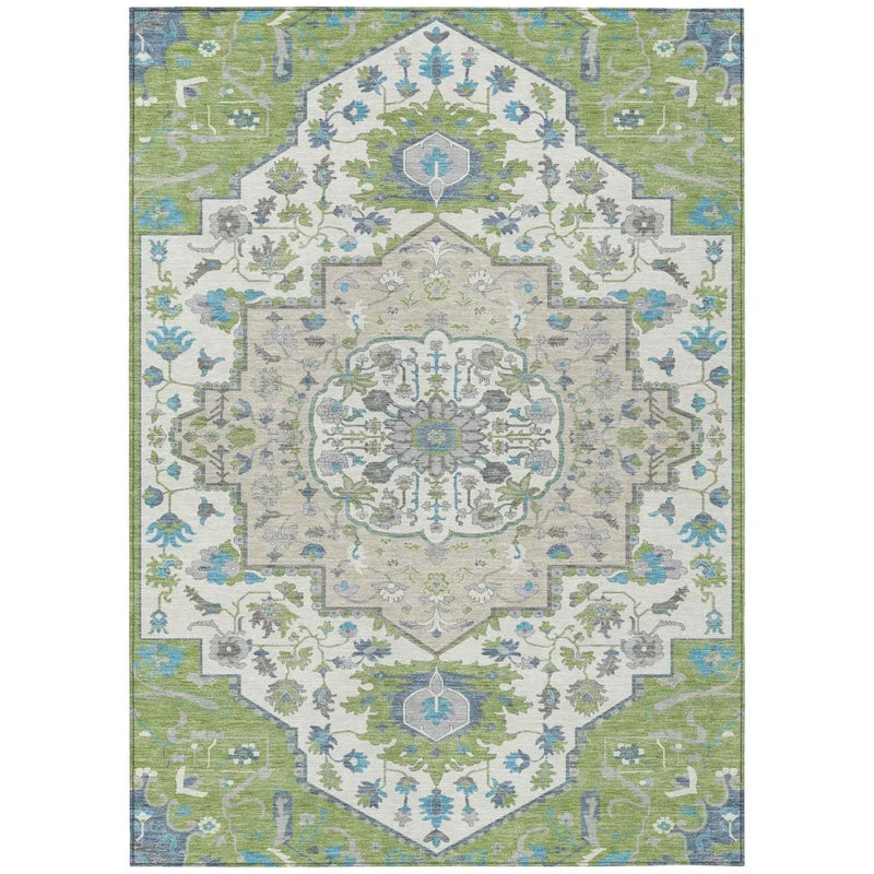 The Lidia Green Washable Indoor-Outdoor Rug adds a touch of elegance to any space with its traditional and vintage large center medallion design. This stunning area rug captures the essence of classic oriental styles, bringing sophistication to your home. Crafted from high-quality polyester, it offers the perfect blend of durability and beauty. Its vibrant green color is enhanced with UV stabilization, ensuring the rug maintains its rich hue whether placed indoors or outdoors. The ultra-thin construction allows for seamless placement in various settings, making it a versatile addition to your decor.