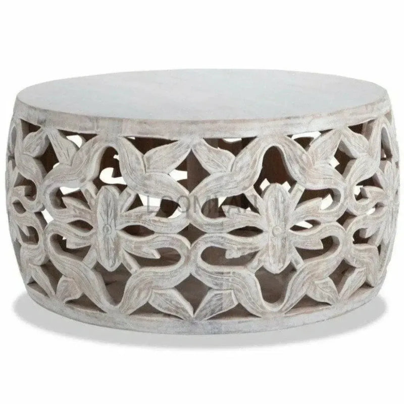 Elevate your living space with our 32" Olvenne Mango Wood White Wash Drum Coffee Table. Crafted by skilled artisans in India, this exquisite piece boasts a water-resistant lacquer finish and a striking hand-carved floral design. Made from eco-friendly mango wood, each table is unique. Experience the epitome of luxury and craftsmanship in this one-of-a-kind furniture. Constructed using tongue and groove joint techniques, this coffee table features a water-resistant white wash lacquer finish that encircles a captivating hand-carved floral pattern. The natural variations in the wood highlight its handcrafted style, making it perfect for any occasion.