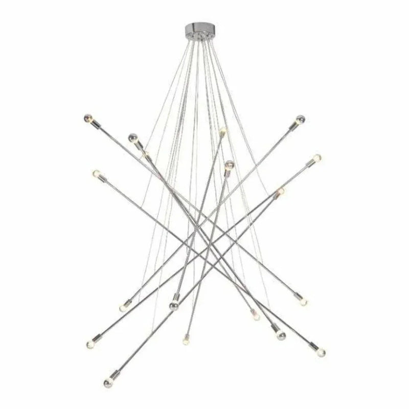 The Belief Ceiling Lamp makes a striking statement with long chrome arms arranged in an elegant crisscross pattern, each tipped with half chrome bulbs. This modern fixture enhances residential or commercial entryways, stairwells, and vaulted ceilings with warmth and sophistication. UL approved and equipped with eighteen 25W G45 incandescent bulbs, it effortlessly elevates any space.