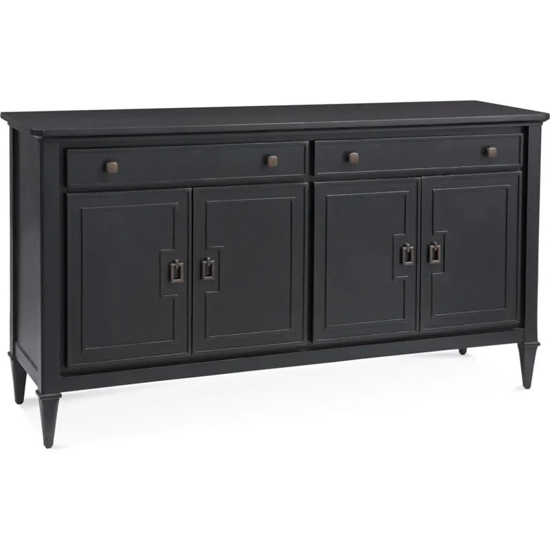 The Hudson Server features an all black finish, with geometric details giving it an Asian flair. This sideboard provides ample storage between the two upper drawers and two cabinets. The top drawers feature black felt lining.