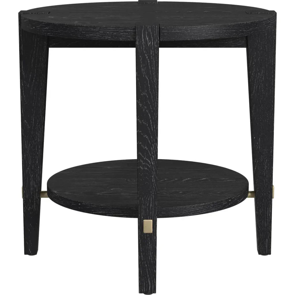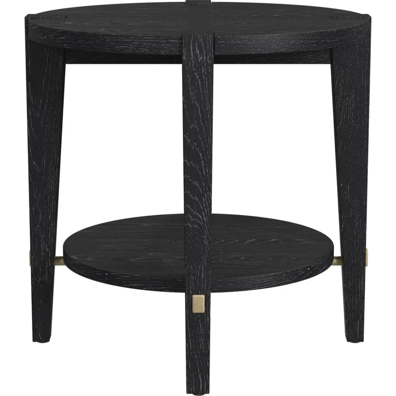 The Whitfield End Table has a modern style. The legs and top feature an interlocking design, constructed with rubberwood solids and flat-cut, cerused oak. The table is finished in a black stain with generous white wax hang-up in the open grain. Brushed gold cross bars accent the base, piercing through the legs. Be bold and bring your living space to life with the Whitfield Wood Black Round End Table!