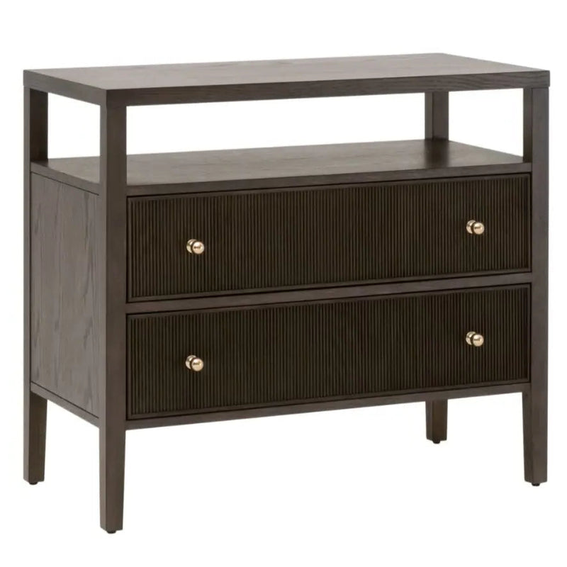 The Highland Open Shelf 2-Drawer Nightstand by Essentials For Living seamlessly combines practicality with transitional style, making it a perfect addition to any bedroom decor. Crafted from solid oak wood and oak veneer, this stunning nightstand is available in two rich finishes: Dutch Brown Oak and Natural Oak, both complemented by polished brass drawer knobs that add a touch of sophistication. Measuring 34” wide, 17” deep, and 30” high, it offers generous storage space, ideal for keeping your essentials close at hand. The two drawers, featuring fluted wood fronts, create an eye-catching design that elevates the overall aesthetic of your room. Equipped with dual metal glides—either standard or soft-close—they ensure smooth operation and secure closure, safeguarding your valuables.