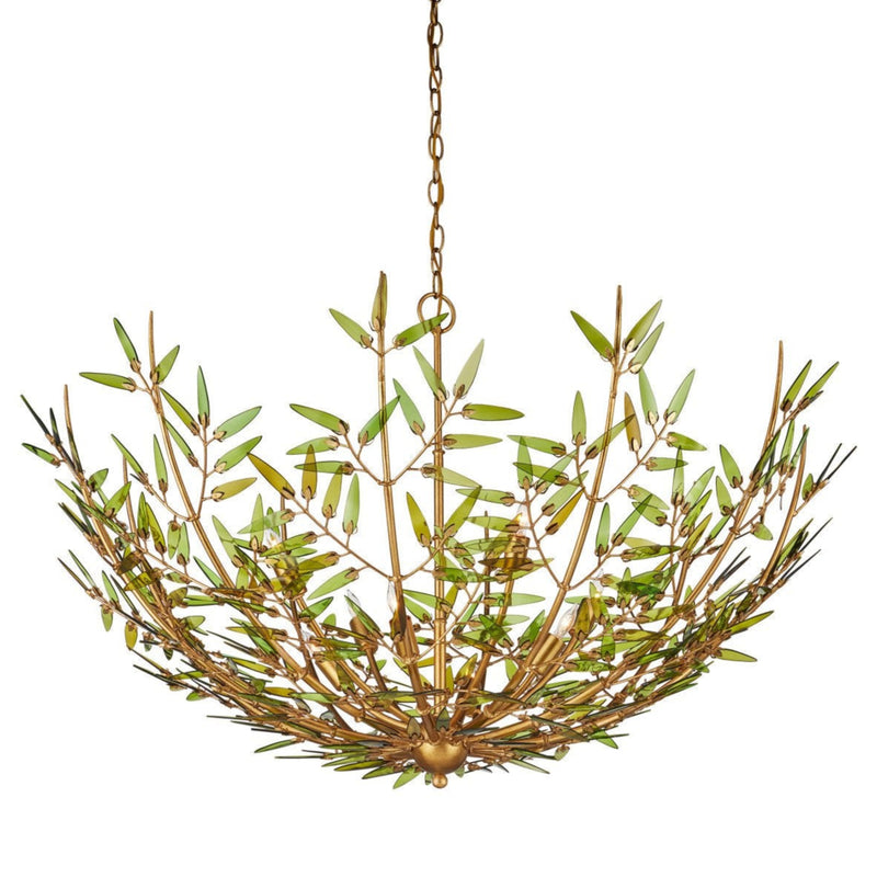 Adjustable from 33 to 101 inches, this versatile chandelier can be tailored to fit any space with the included chain, rod, and cable kit. For those needing a longer drop, additional lengths are available for purchase, ensuring the perfect fit for rooms with high ceilings. Its natural design, featuring spikey leaves and gold branches, brings a sense of the outdoors inside. Ideal for dining rooms, living areas, or entryways, the Babylon Chandelier provides ample light and a touch of elegance. Its blend of recycled glass and wrought iron makes it not just a lighting fixture, but a piece of art that enhances the atmosphere of any space.
