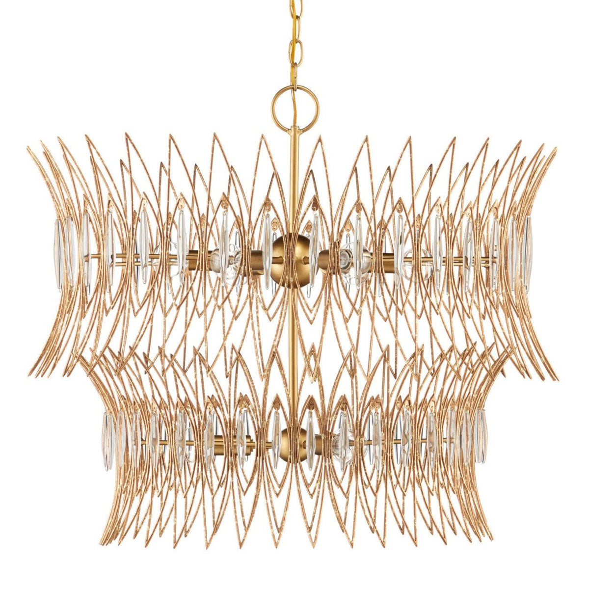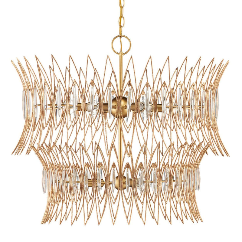 The Marquise Medium Gold Chandelier is a stunning centerpiece for any room. Made from slender wrought iron wires finished in Luxor gold, it has a speckled texture that adds a touch of elegance. The design draws inspiration from mid-century jewelry, with two-tiered crown-like frames that hold abstract leaf motifs. Each leaf is adorned with clear glass pieces, beautifully catching and diffusing light from the nine bulbs inside. This chandelier gives any space a soft, welcoming glow, perfect for setting the right mood.