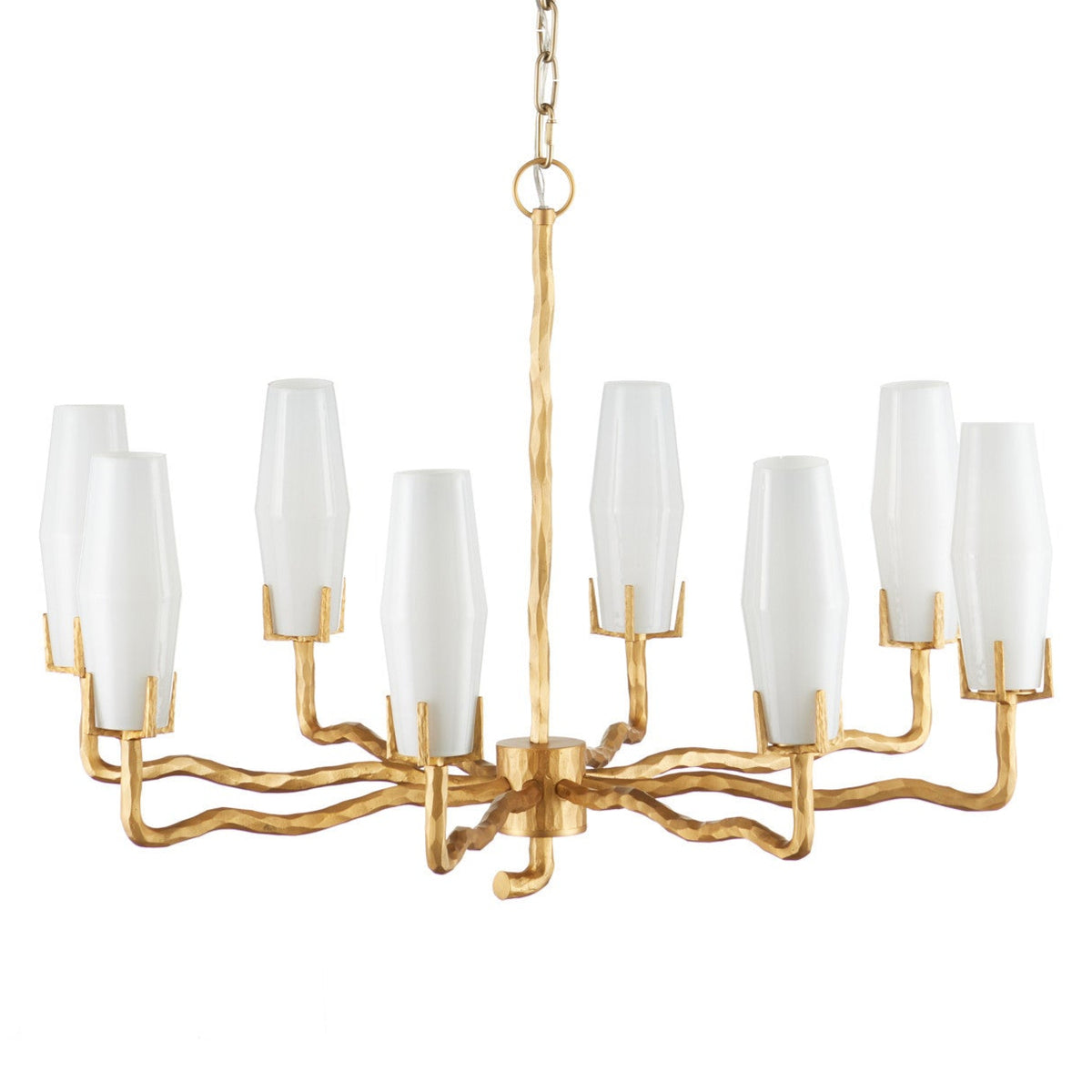 The Mathilda Chandelier is a standout piece of lighting that adds a touch of artful elegance to any room. Made from durable cast brass, it comes in a matte gold finish that highlights its unique, bold design. With eight milky white glass shades, this chandelier offers a soft glow that enhances its refined look. Its sculptural prongs evoke the beauty of fine jewelry, creating a striking contrast between the raw texture of the brass and the delicate detail of the glass. This design makes the chandelier both a practical lighting solution and a decorative centerpiece.