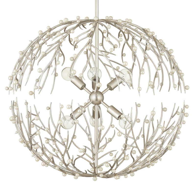 The Shinju Pearl Orb Chandelier brings elegance to any room with its unique design. Made from wrought iron, the chandelier showcases a contemporary silver leaf finish. Its flowing branches are adorned with fresh-water pearls, adding a touch of nature-inspired beauty. These pearls reflect light from the six bulbs, creating a warm and inviting glow. Designer Aviva Stanoff has crafted a piece that captures the essence of an organic seascape, making it a standout feature in any home.