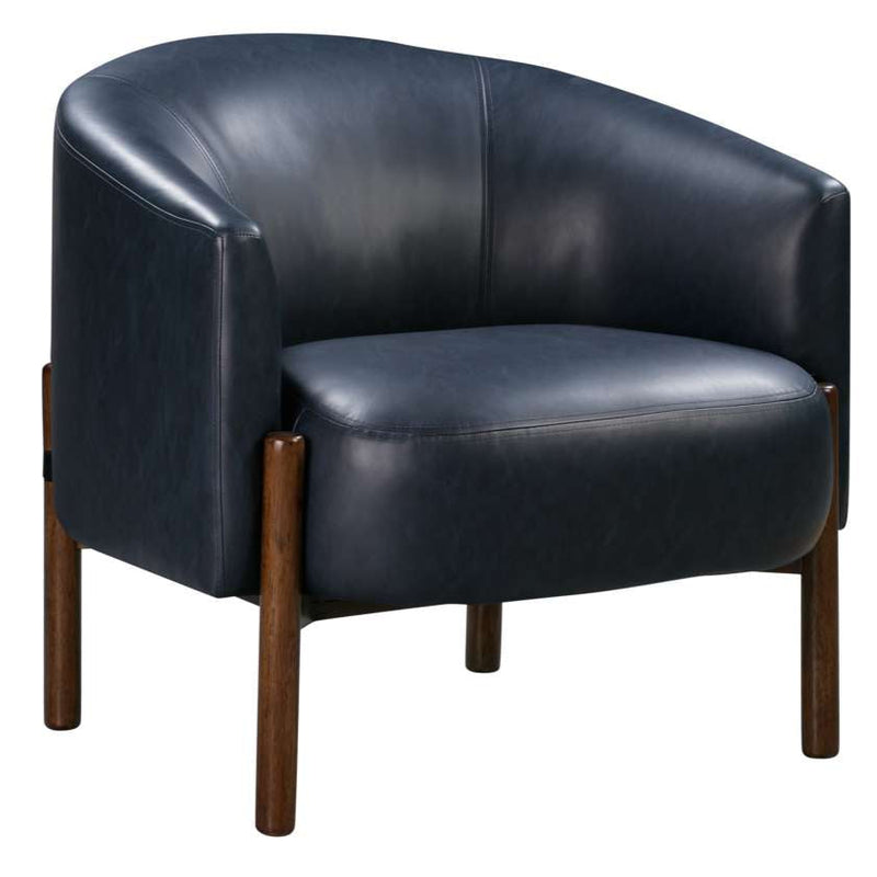 The Higgins Accent Chair is a modern take on the classic barrel chair featuring a unique exposed wood base in a warm walnut finish and metal stretcher that hugs the outside of the seat back. The chair is constructed with a combination of high-density foam and fiber fill and the fabric is a stain-resistant 100% polyester performance faux-leather in a deep, rich navy-blue color.