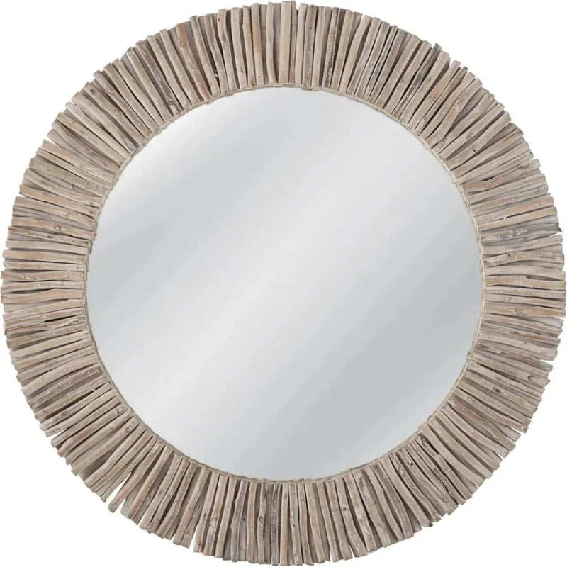 Splay Wall Mirror is a round decorative wall mirror made of eucalyptus reeds. The mirror frame features white washed eucalyptus stick and mango wood. Includes two "D" ring attachment points for ease of access for hanging. The hand crafted details produced by a skilled artist lends itself to a unique technique and will vary slightly. Unleash your bold side and grab a taste of adventure with the Splay Wall Mirror.
