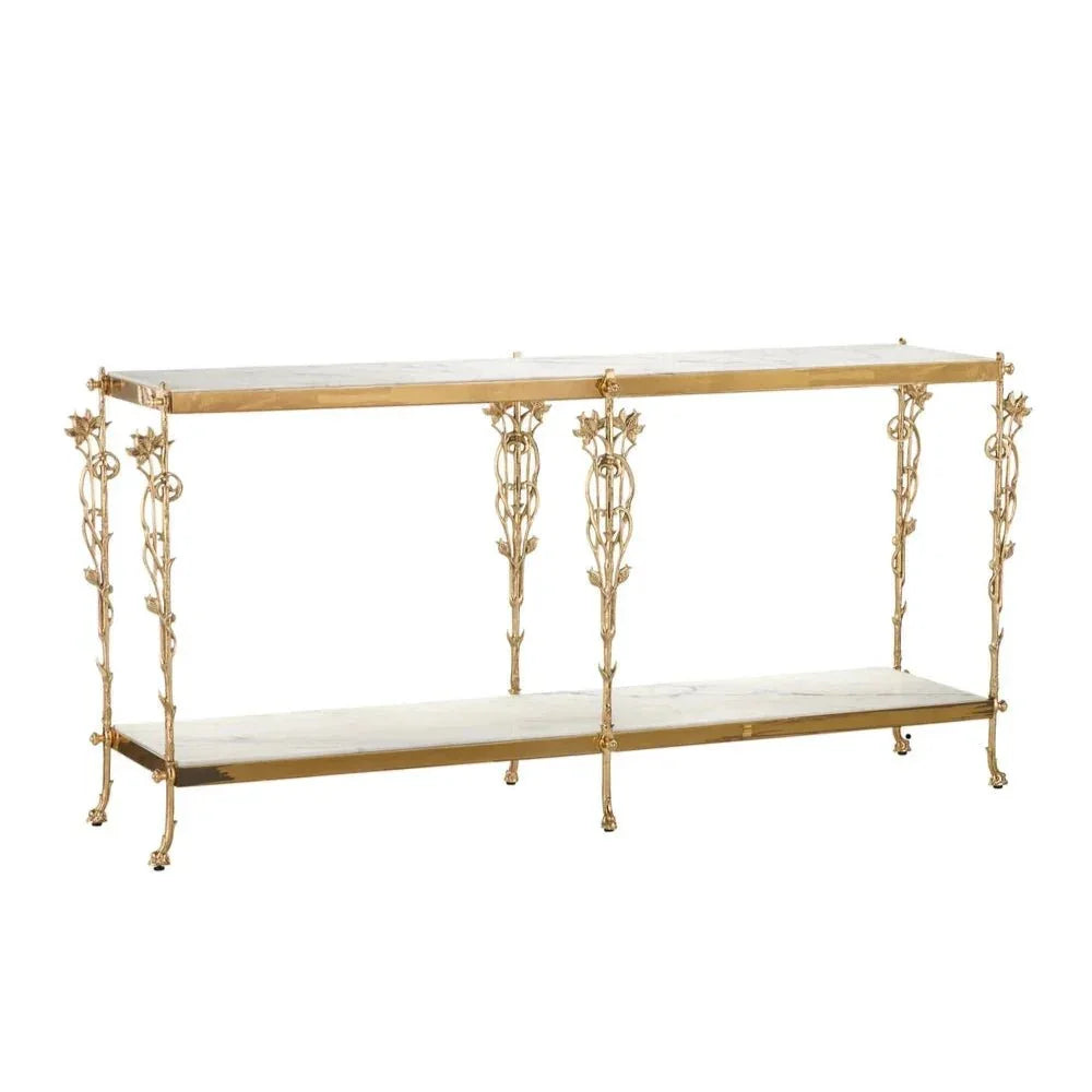 The Fiore Console Table is a stunning piece that brings elegance and charm to any room. Its design features floral motifs that gracefully flow up each of its legs, ending in a sleek metal band. This band holds a beautiful white marble top, creating a striking contrast with the polished brass finish. This table not only offers a visual delight but also provides a sturdy and durable surface for displaying items. The natural stone and brass materials are carefully crafted to ensure long-lasting quality, making it a perfect choice for those seeking both style and functionality.