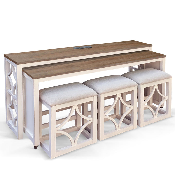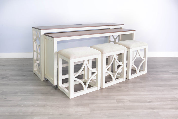 Elevate your living space with this versatile Rockwell Nesting 5-Piece Console Table Set With Power Outlets. Expertly crafted from mahogany, the set adds a chic touch to your home decor. The larger console table serves as a sleek focal point, perfect for displaying your favorite decor, while the smaller table tucks underneath, ready for extra surface area when needed. The timeless white finish complements various decor styles, making it a stylish addition to any room. With built-in power outlets, you can easily charge devices without cluttering your space with cords. No assembly required, this set is perfect for instant use.