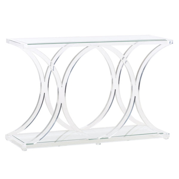 Making a small entryway or narrow hallway feel both spacious and stylish requires furniture that doesn't visually dominate the room -- but most console tables are either too bulky or too flimsy to strike that balance. The Chelsea House Sweeping Acrylic Rectangular Console Table is a 45-inch clear acrylic entryway table built for spaces that need visual lightness without sacrificing surface area, available at LOOMLAN with free shipping to the continental US. This sculptural piece uses intersecting circular base curves and double glass shelves to create movement and depth while maintaining the see-through quality that keeps narrow spaces from feeling cramped. At just 14.5 inches deep, it's perfectly sized for entryways, behind sofas in tight living rooms, or flanking doorways where traditional wood furniture would feel overwhelming.