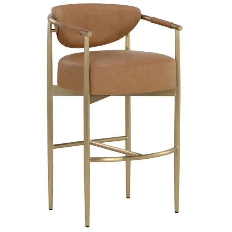 Every detail of the Heloise Barstool is crafted with intention and style. Its Milliken cognac faux leather upholstery is both elegant and practical, offering a sophisticated look that enhances any dining space. The rope detailing adds a unique touch, while the powder-coated gold stainless steel frame provides a sturdy and stylish base. Visible stitching on the seat highlights the smooth contours of the barstool, making it as comfortable as it is attractive. This barstool strikes a perfect balance between design and function, making it an excellent addition to your home.