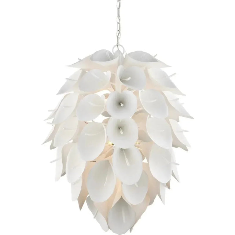 The Diego Chandelier is a magical teardrop-shaped fixture made from wrought iron in a white gesso finish. This graceful chandelier was designed by Marjorie Skouras to continue her celebration of the Yucatan Peninsula that she calls home. The Calla Lily, which flourishes in her surroundings, inspired this white chandelier, which joins a number of her offerings that celebrate the flora and fauna around her studio. Adjustable from 40.25" to 108.25" with use of included chain/rod kit/cable. If your space calls for a longer drop, additional chain/rods/cable is available for purchase.