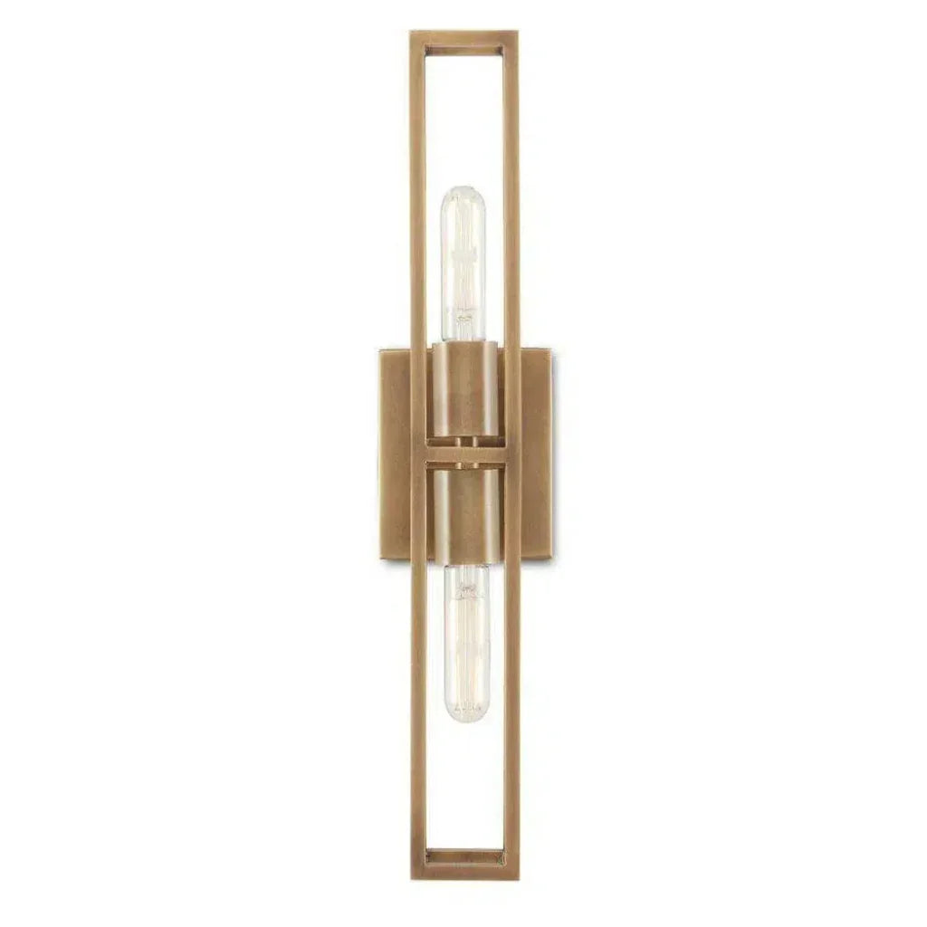 Floating within an elongated cage, the two bulbs that illuminate the Bergen Brass Wall Sconce are as lean as the overall profile of the gold sconce. Made of metal in an antique brass finish, the Bergen has a sophistication to its lines given they are pared down and perfectly formed. This wall sconce is ADA compliant and certified for damp locations. Part of the Bagno Collection of wall sconces designed for bathroom spaces.