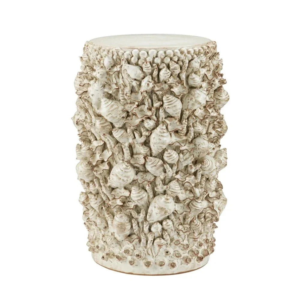 Standing at 19 inches tall with a diameter of 12.5 inches, the Corfu Ivory Accent Table is compact yet striking, perfect for adding a decorative touch without overwhelming your space. Its ivory color family complements a wide range of interior styles, while the barnacle-like shapes on the top and bottom enhance its coastal theme. Despite its delicate appearance, the table is robust and durable, weighing in at 40 pounds, ensuring stability. Ideal for living rooms, bedrooms, or entryways, this ceramic table not only serves a practical purpose but also acts as a conversation starter, drawing admiration for its detailed design.