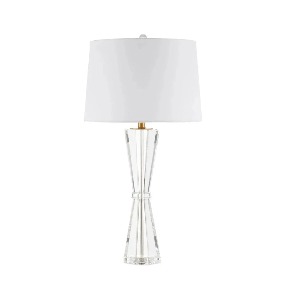 The Duveen Table Lamp is a stunning addition to any modern space. Crafted with precision, it features an elegant hourglass shape made from clear optic crystal. This unique design swells beautifully at the top and bottom, creating a captivating silhouette. An octagonal ring cinches the waist, adding a touch of sophistication. The polished brass finish enhances its luminous quality, making this lamp a striking focal point even when not lit. Its contemporary style effortlessly complements a variety of interior decors, adding both elegance and charm.