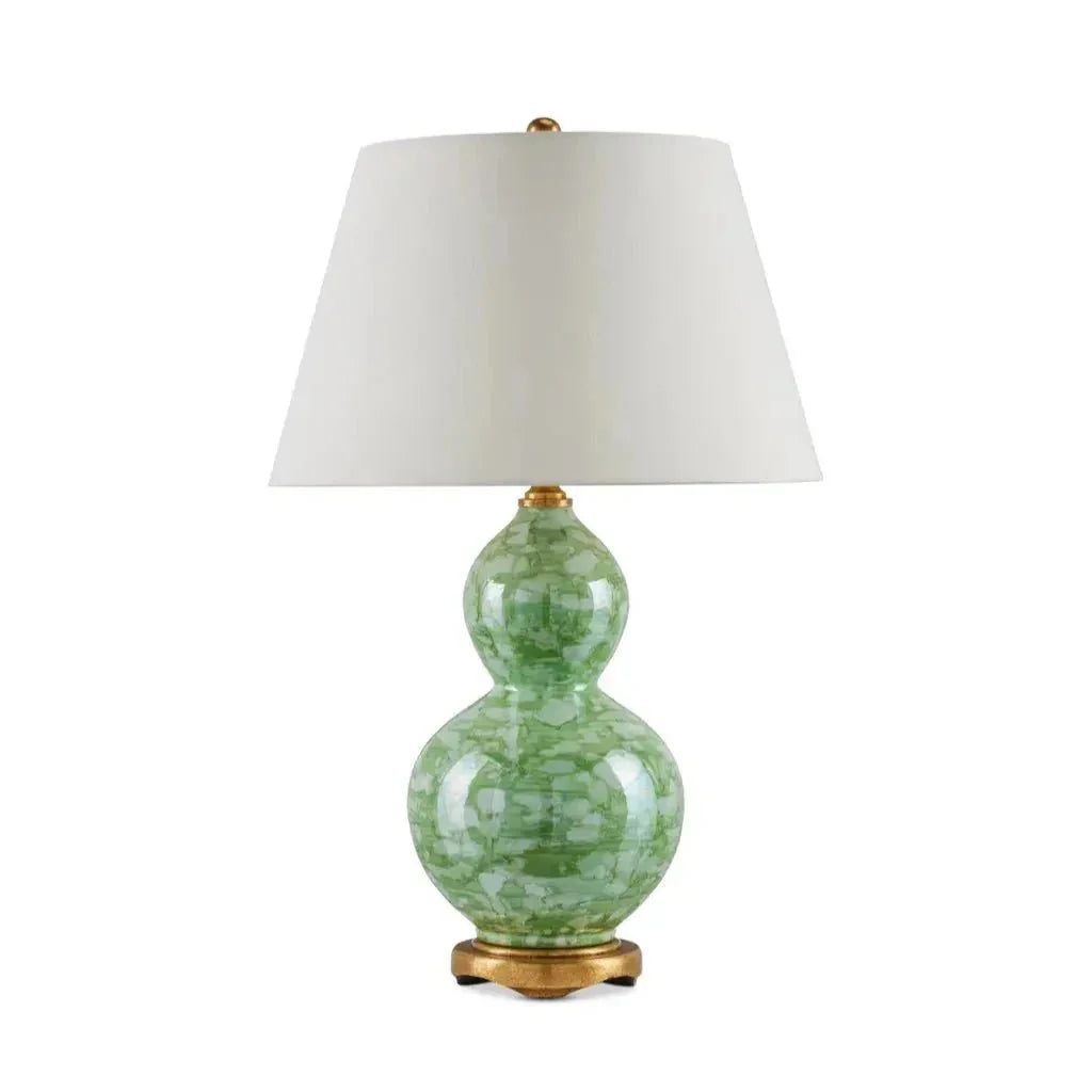 The Eau de Nil Table Lamp brings a touch of elegance to any room with its soft green hue and graceful design. Crafted from porcelain, its double-gourd shape is adorned with a marbled pattern, creating a serene cloud-like effect. This lamp is not just about style; it offers a warm and inviting glow to your space. The textured antique gold leaf finish on the metal and wood base adds a layer of sophistication and charm, making it a perfect fit for traditional settings.