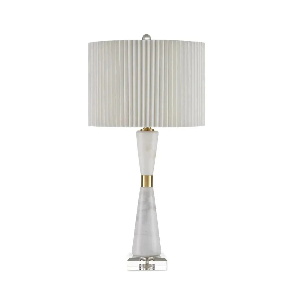 The Edelmar White Table Lamp brings a touch of elegance to any room with its sleek design and sophisticated materials. The lamp features a white marble body, gracefully cinched in the middle by a natural brass ring. This striking combination of materials sits proudly on a clear optic crystal base, providing a sense of stability and charm. The off-white shantung shade, with its knife-pleated design, adds a refined touch, enhancing the lamp's overall appeal. An optic crystal finial on top completes the composition, making it a perfect choice for those who appreciate fine craftsmanship and contemporary style.