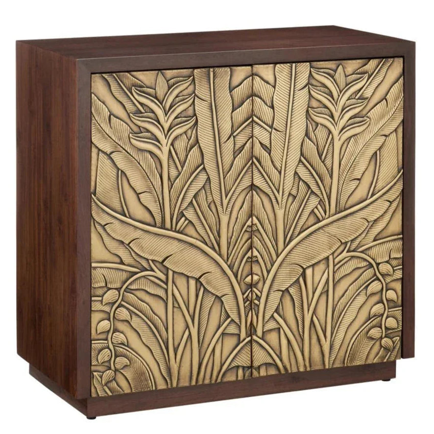 The Jardin Cabinet is a beautiful piece of furniture that combines art and functionality. This cabinet is crafted from reclaimed teak wood, known for its durability and elegant appearance. The cabinet's walnut finish brings out the natural beauty of the wood, while the antique brass accents add a touch of sophistication. It stands 38.5 inches tall, making it an ideal choice for those looking to add a statement piece to their home. The intricate leaf pattern on the doors showcases a botanical design, providing a sense of nature and tranquility.