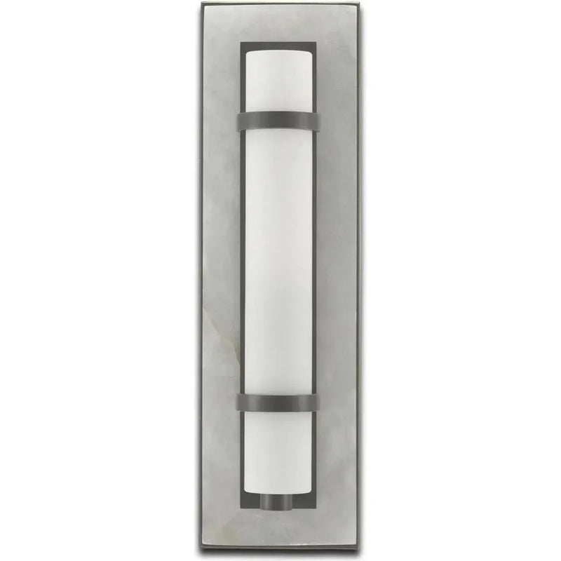 A masterful mix of materials describes the Bruneau Bronze Wall Sconce. From the cloudy alabaster panel affixed to the wall plate, the metal in a warm oil-rubbed bronze finish, and the soft glow of the opaque glass shade, the layering of this design is sophisticated. The strap-like circlets that fasten the shade to the wall plate on this black wall sconce is a design detail worth noting. Part of the Bagno Collection of wall sconces designed for bathroom spaces.