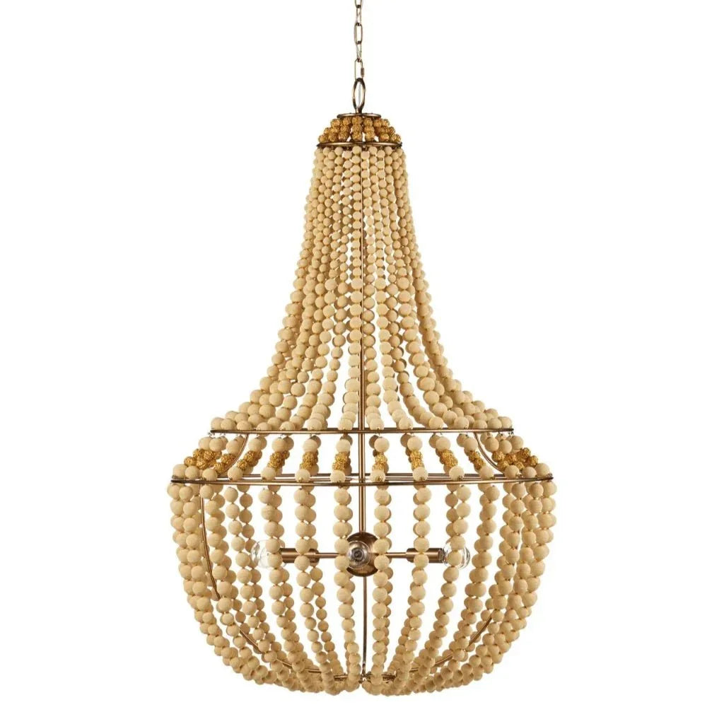 The Penelope Beige Chandelier brings elegance and warmth to any room with its stunning design. Crafted from antique brass-finished wrought iron, this chandelier features a traditional empire shape that exudes sophistication. Its unique design showcases beige beads made from silken fabric and metal beads resembling golden nuggets, adding a touch of luxury to the piece. Ideal for indoor use, this chandelier enhances the ambiance of any living space, dining room, or entryway with its soft, inviting glow. The bohemian style adds a charming and eclectic touch, making it a perfect fit for various interior styles.