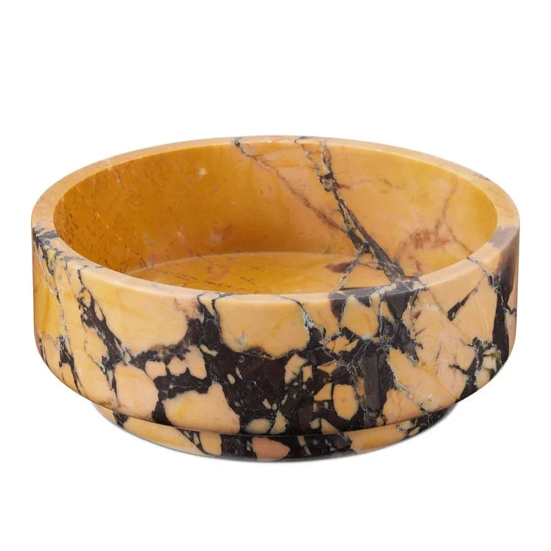 Expertly crafted in India, the Purple Breccia Digby Bowls artfully showcase the unique and elegant qualities of Purple Breccia marble. The medium-sized bowl, featuring a polished finish, displays a stunning blend of purple, peach, and yellow hues, accentuated by bold black veining. Measuring 10 inches in diameter and boasting a 4-inch height, this bowl is versatile for both functional use and decorative display. Its distinctive veining guarantees a one-of-a-kind addition to any home decor.