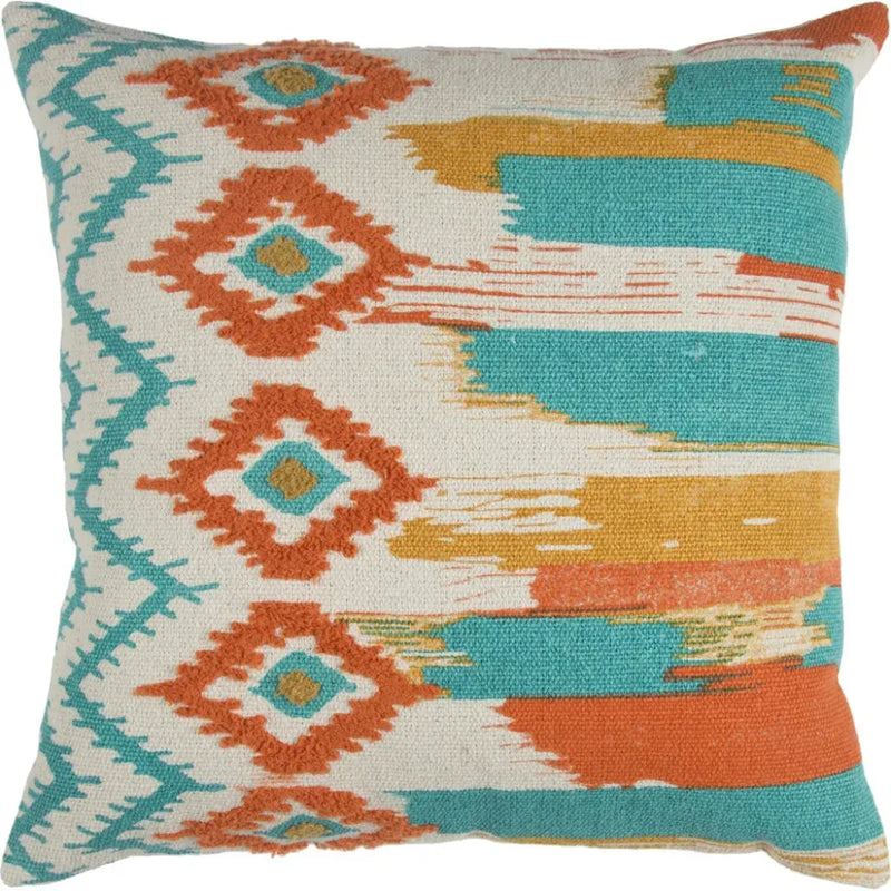 This pillow is printed on cotton canvas which gives it a light texture. Printed with a brush stroke pattern that dry brush ends into ikat patterning that is embroidered using crewel machine embroidery. Slashed chevrons round out this tribally influenced artisanal look. Knife edged, this pillow features a solid coordinating cotton back with a hidden zipper closure. This boho chic throw pillow from Rizzy Home is the perfect accent for any rustic-inspired modern living space. Crafted from durable cotton canvas, this pillow features a unique ikat diamond pattern ending in a subtle brushstroke design in vibrant shades of teal, orange, and gold. The hidden zipper closure allows you to easily remove the pillow cover for convenient cleaning and maintenance. This stunning throw pillow is perfect for elevating any living space with an accent of color and artistic inspiration.