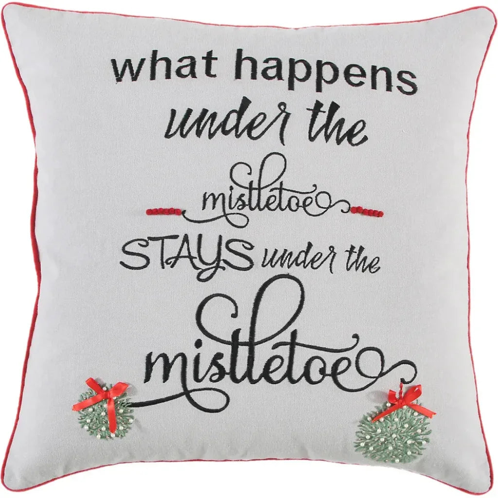 This whimsical humorous sentiment speaks to the romance and fun that is the holiday season. Machine embroidery creates the lettering; hand embroidered wreaths, hand applied beading and hand tied French knots bring the crafted appeal. The contrast red welting frames the pillow. This pillow features a solid matching back with hidden zipper closure for ease of fill. Add some whimsical mistletoe sentiment to your holiday decor this season with this lively Rizzy Home accent pillow. Whether you've been naughty or nice, this pillow is a fun conversation starter for any holiday event, seating area, or bedding, to create some festive seasonal charm to your decor. Featuring hand beaded detailing and hand-tied French knots, this pillow creates a bit of playful charm in a textured modern craft style. The contrast welting encases the soft palette design in cheerful red, showcasing the brightly colored hand embroidered wreaths. Seasonal, sassy charm in your home decor this holiday season? Check.