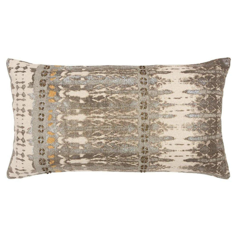 This tribally inspired distress printed pillow features an impressionistic skin pattern. Silver foil printed accents give it just a kiss of bling. Hand beaded accents give it a light dimension. This pillow is printed on a lightly textured base which adds soft dimension to its patterning. Knife edged, this pillow has a coordinating solid back with a hidden zipper closure for ease of fill. This urbane 14" x 26" accent pillow from Rizzy Home is the perfect way to create some chic sophistication within an ultramodern industrial trend. The unique, abstract design coupled with hand beaded accents create texture and distinguished style in an ultimately distressed print. In a color wheel of gray, natural, gold and silver, with light foil print accents, this refined pillow is on trend and can heighten any room décor or seating area with classic finesse.