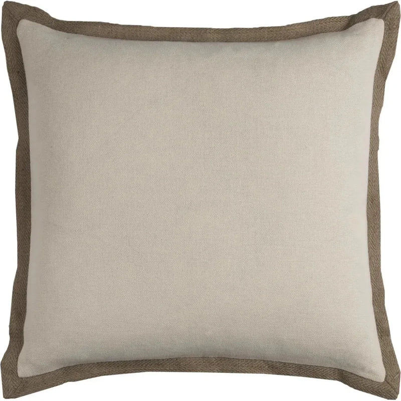 Soft natural jute, dyed, is the fabric of this basic solid pillow. A natural jute flange is added to the perimeter. The back is the same as the front solid and features a hidden zipper closure. This large scale solid is perfect for over scaled furniture, layered with other coordinates, or alone as a statement solid. This large Rizzy Home Neutral Beige and Brown Square Throw Pillow will fit any style of home or office décor. This pillow is essential base for your multi-pillow arrangements. The body of the pillow is a Solid Light Beige and the flanged edge features a contrasting brown cotton jute material. The back of the pillow has a hidden zipper to allow the removal of the polyester fill before machine washing.