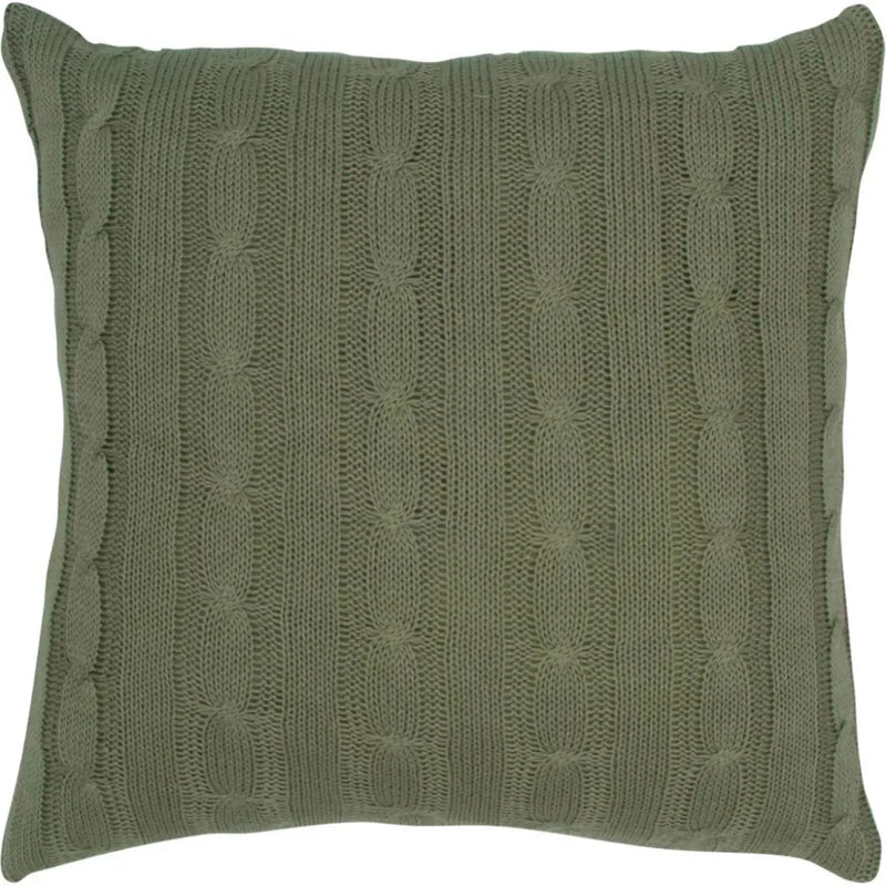 Soft cotton cable knit rows comprise this wonderfully casual pillow. Wooden button closure gives this pillow the option of being displayed as a solid or feature the crafted look of the wooden button. Knife edged, this pillow features the same delightful knit pattern front and back (whichever you deem that to be). The classic look of cable knitting is captured in this Rizzy Home Olive Green Throw Pillow. This item is knitted of 100-percent cotton that is machine washable. The pillow boasts a beautifu, cable knit design that is eye-catching and easily blends with many home decor styles. The reversible cover and brown wood buttons make this piece a perfect accent to any room in your home.