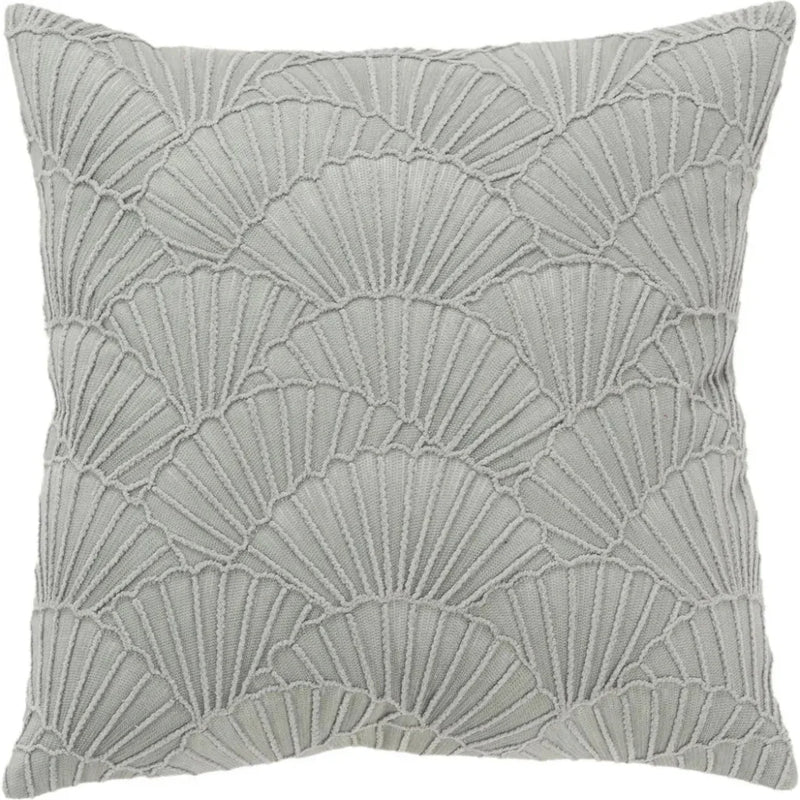 This pillow is luxuriously fashioned to add a kiss of glamour to any decor. This pillow is totally covered in directional machine crewel embroidery. This allows the fan shapes to appear to be strewn across the pillow face. The fan or shell shapes are outlined by the application of dimensional cotton chord. This pillow is inner lined to provide stabilization for ALL this stitchery. This pillow is a wonderful hint of subtle sheen and is a wonderful addition to any living space where a little "jewelry" finishes the space beautifully. The back of this knife edged pillow is a solid coordinating cotton with a hidden zipper closure. In alluring ivory and gray hues, this simply stunning accent pillow from Rizzy Home will add coastal charm to any room, evoking the feeling of a seaside breeze and the sunlit glimmer of sandy shells on the shoreline. The sophisticated design and clean lines make it a standout piece in any space, elegant in its simplicity and refinement. The embroidery features a stunning shell design that is crafted with meticulous attention to detail with complete coverage in machine crewel embroidery and applied cotton cord outlines that give the design an exquisite 3D effect. Inner-lined for embroidery stability, the pillow has a solid coordinating cotton back with a hidden zipper closure, providing a seamless, polished finish. Perfect for a range of interior design styles, from coastal to modern, this pillow makes a bold style statement on its own or can be effortlessly paired with other pieces to create a cohesive layered look that is both chic and sophisticated.