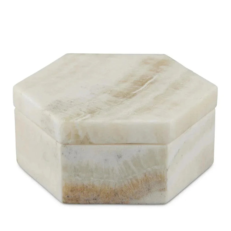 The sleek design of the box exudes a contemporary feel, while the natural patterns of the stone add a touch of personality. Aimee Kurzner's expertly crafted contemporary accessories showcase her dedication to material exploration, making each piece truly special. Experience the true beauty of natural stone with the Arco Onyx Hexagon Box and elevate your space with this exquisite addition.