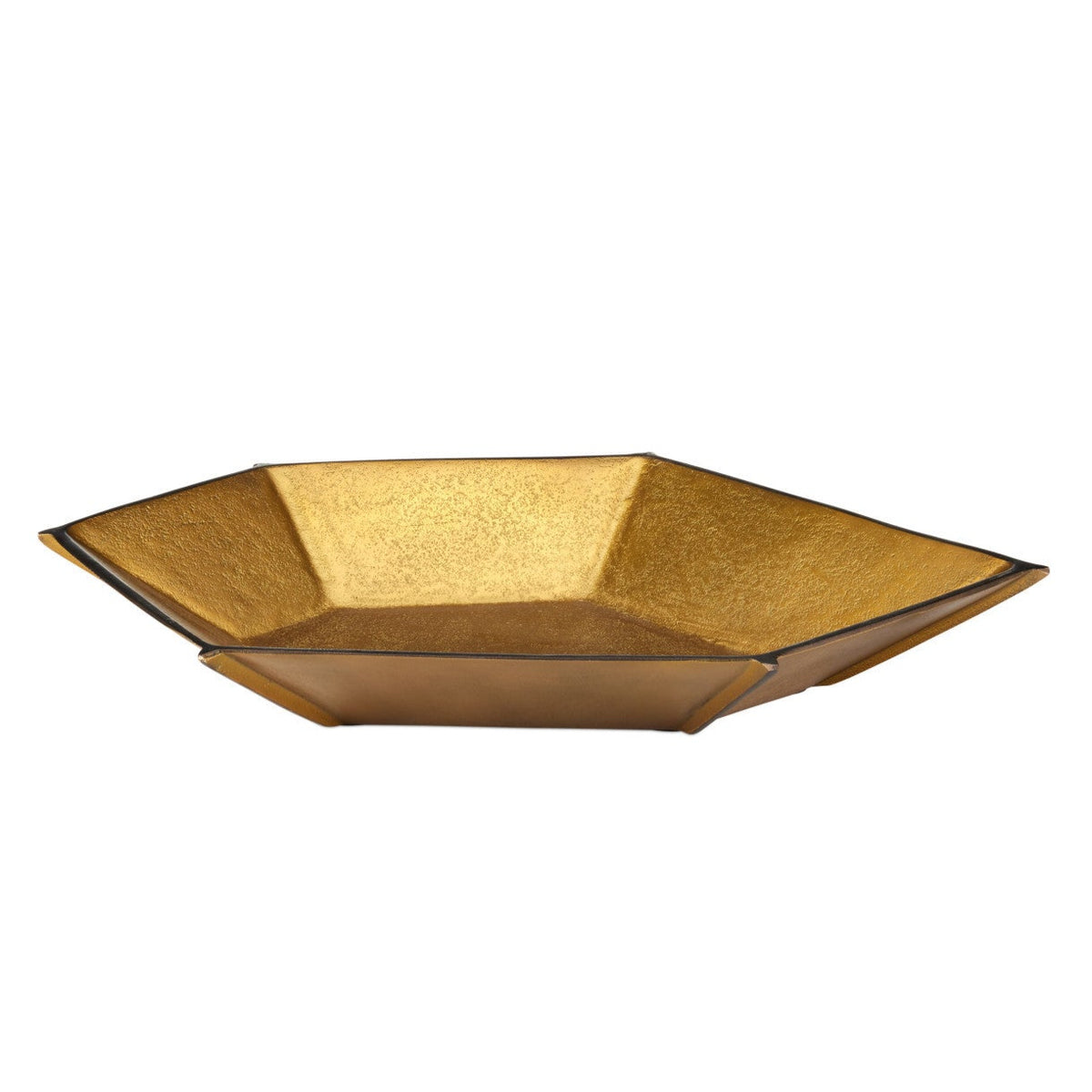 With its rich texture and intriguing design, this bowl is more than just a container—it's a conversation starter. Its shallow depth and hexagonal shape create a modern yet timeless aesthetic that fits seamlessly into various decor styles. The gold exterior with a metallic finish enhances its appeal, making it a versatile piece that can serve as a centerpiece or an accent piece. The bowl's design is complemented by a practical feature: foam at the base, which protects furniture surfaces from scratches and ensures stability.