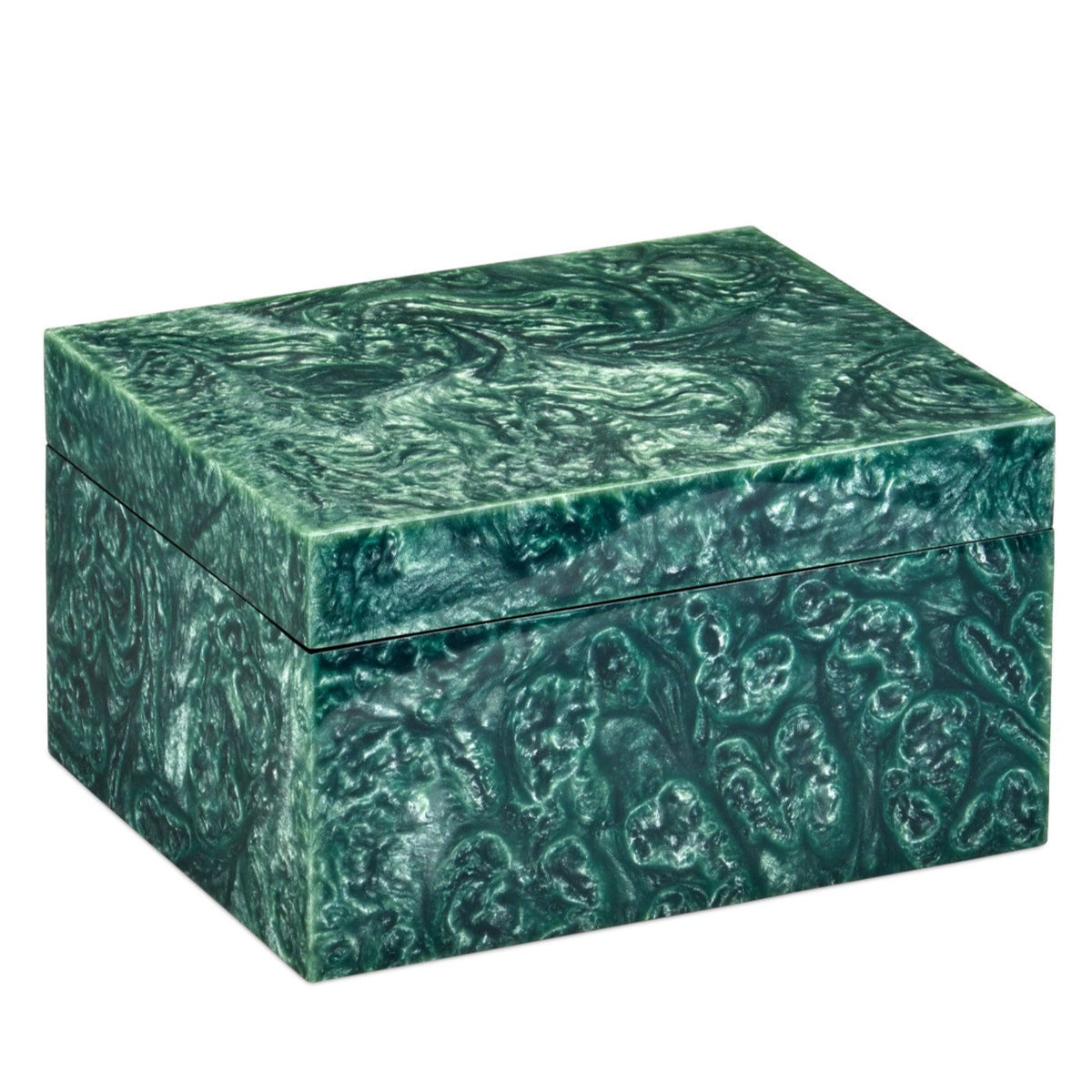 Bring a touch of elegance to your home with the Rina Teal and Green Box. This beautiful storage box is designed to be both functional and stylish, making it perfect for holding cherished items or enhancing any room's décor. The swirling patterns on its surface are created by blending pearlescent powder with composite materials, resulting in a mesmerizing organic look. Its dark green color and glossy finish add a sophisticated touch that stands out in any setting.