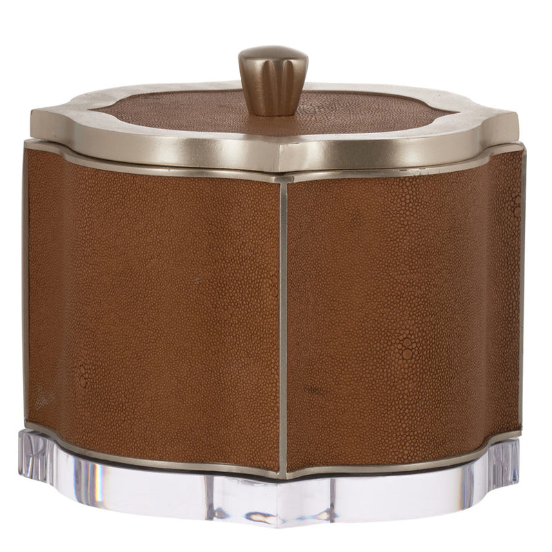 This chic brown faux shagreen box is a beautiful addition to any room. Resting on a clear acrylic base, it combines texture with a modern see-through look. The silver edging and sleek handle give it a stylish touch that stands out on any surface. Its unique design by Shayla Copas makes it both a practical and decorative piece, perfect for storing small items while adding a touch of elegance to your home decor. Whether placed on a shelf, desk, or dresser, this box is sure to catch the eye and elevate the space around it.