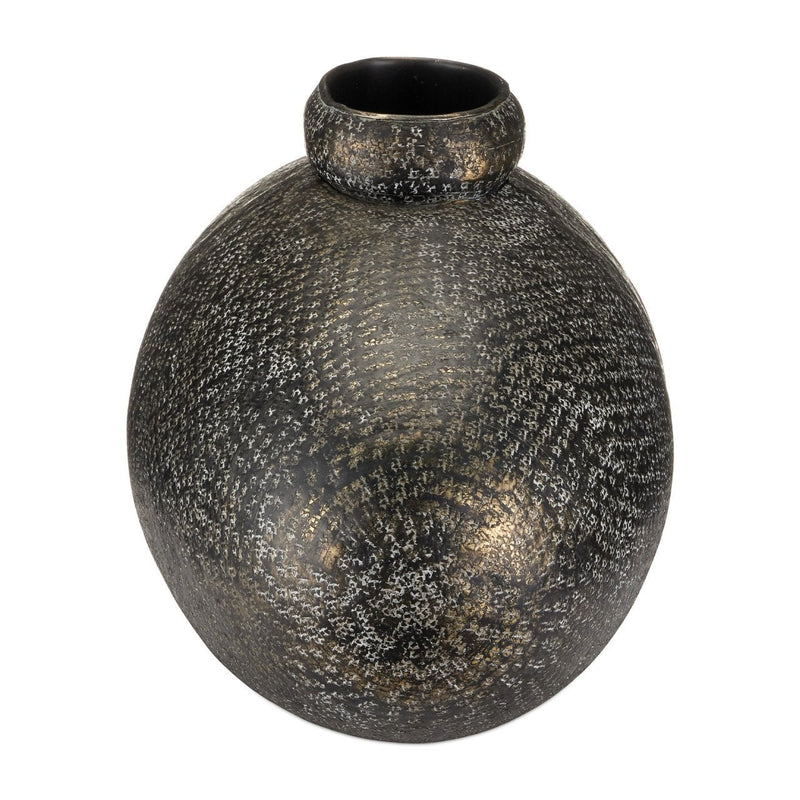 The Brigadier Vase is a stunning decorative piece that adds elegance to any room. Made from durable aluminum, it boasts a unique submarine shape designed to fit perfectly on narrow tables and nightstands. Its wide body and narrow opening make it both stylish and functional. The surface of the vase features a captivating blend of gold, bronze, and white tones, creating a rich depth and texture. The hand-hammered detailing further enhances its appeal, making it a standout piece in any decor.