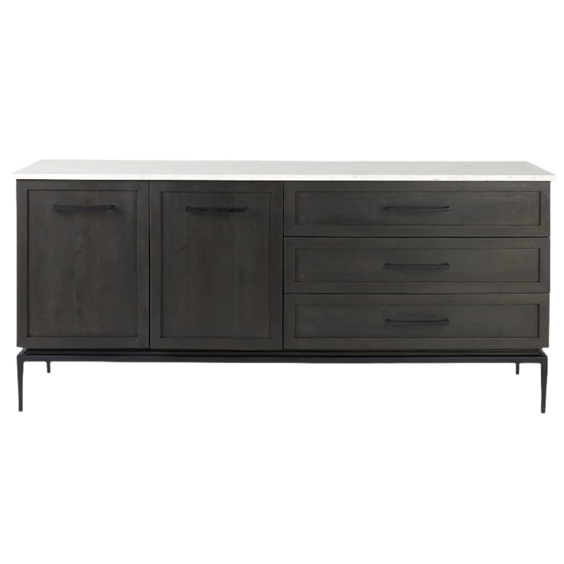 The Divina White Marble Top Sideboard is an exquisite addition to any modern or contemporary home. Crafted with care, it combines solid black-brown mango wood with a stunning white marble top, creating a piece that's both functional and stylish. The sturdy iron base adds durability, ensuring this sideboard stands the test of time. With its sleek handles and minimalist design, it seamlessly fits into any dining or living space, offering a blend of elegance and practicality.
