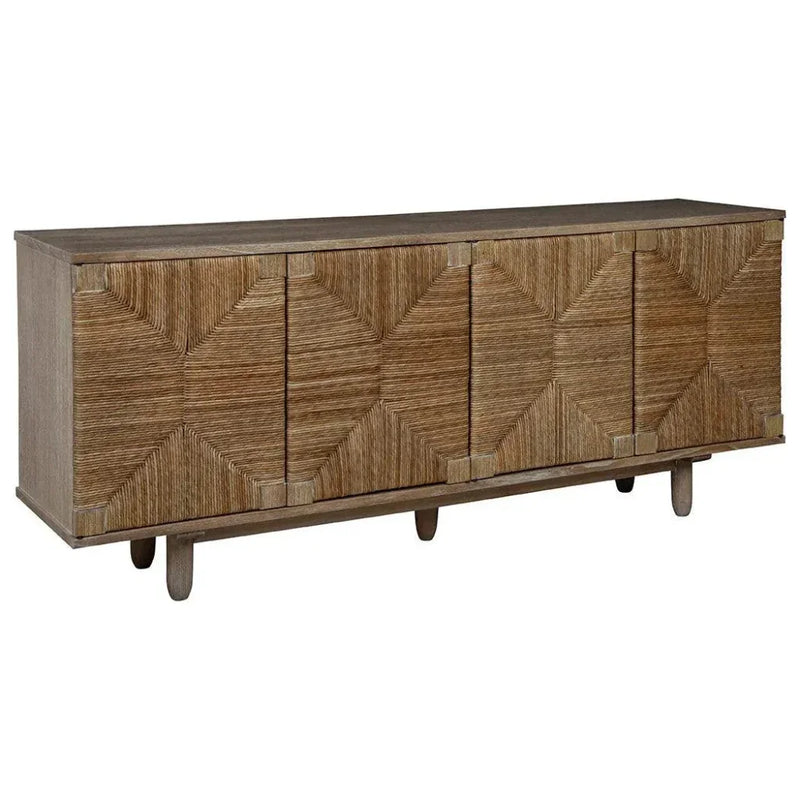 Add a touch of eclectic charm to your boho or farmhouse interior with the Jamestown Sideboard. Crafted from sturdy solid wood, this sideboard boasts a natural brown finish that complements a variety of decor styles. The design features four doors, each adorned with intricate weaving that adds texture and visual interest. These doors open to reveal ample shelving space, offering a practical storage solution for your dining room, living room, or hallway. The combination of style and functionality makes this sideboard a versatile and stylish addition to any home.