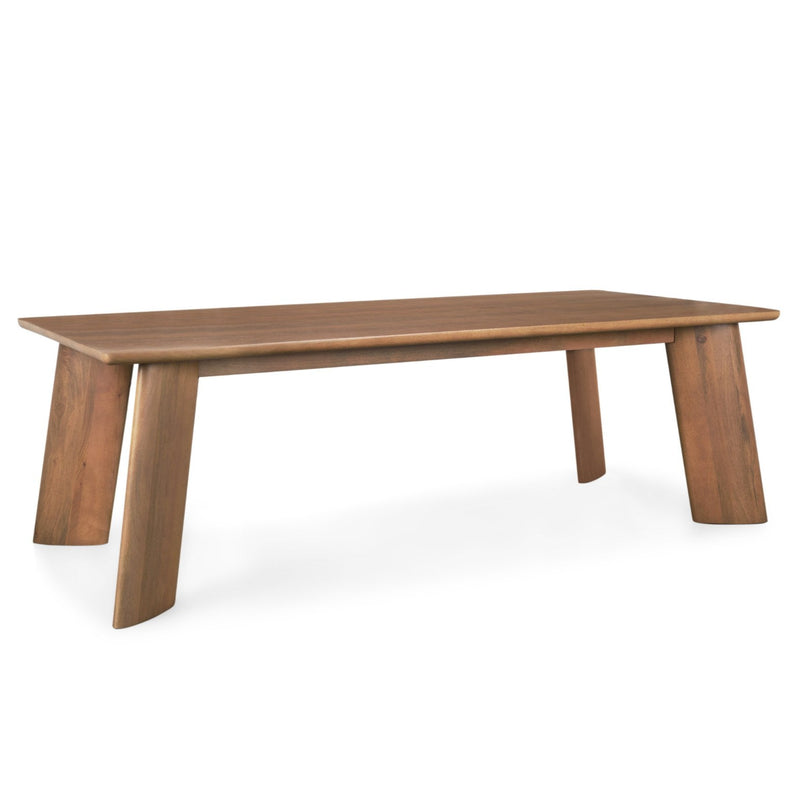 The Jonan Wooden Dining Table brings a touch of modern elegance to any dining area. Made from solid mango wood, it showcases a rich brown stain that highlights its natural beauty. The rectangular tabletop has elegantly rounded edges, offering both style and safety. Its design is as functional as it is beautiful, making it a perfect fit for family dinners or entertaining guests. Its substantial oval legs, angled inward, create a sculptural and dynamic base that enhances its clean, minimalist look.
