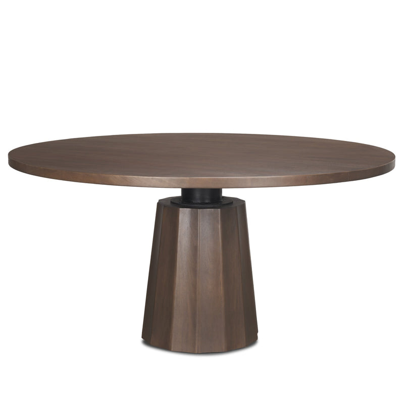 The Swanson Wooden Round Dining Table offers a perfect blend of style and functionality for your dining space. Crafted from solid mango wood, this table features a masculine dark matte and light brown finish. The sleek matte black iron metal neck adds a modern touch, making it a captivating centerpiece for any room. With a spacious round top, it provides ample room for family gatherings and dinner parties. Its elegant design is complemented by a tapered solid wood pedestal base with a stunning scalloped effect, adding a touch of sophistication to your dining area.