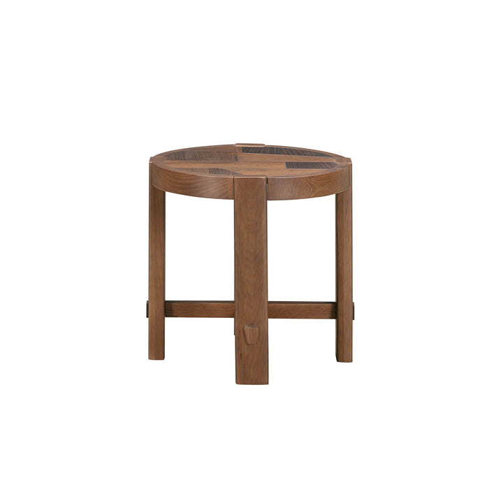 The Abstract Side Table With Checkerboard Detailing adds style to any room. It's a compact, versatile piece that fits perfectly beside a chair or bed. The round top features a unique checkerboard surface, giving it a distinctive look. The sturdy cross-base leg design ensures stability and durability. Made with a mix of oak, oak veneer, rubberwood, and MDF, this table is both attractive and strong. The brown color blends well with various decor styles. Whether you're looking for a functional table or a decorative piece, this side table offers both elegance and practicality.